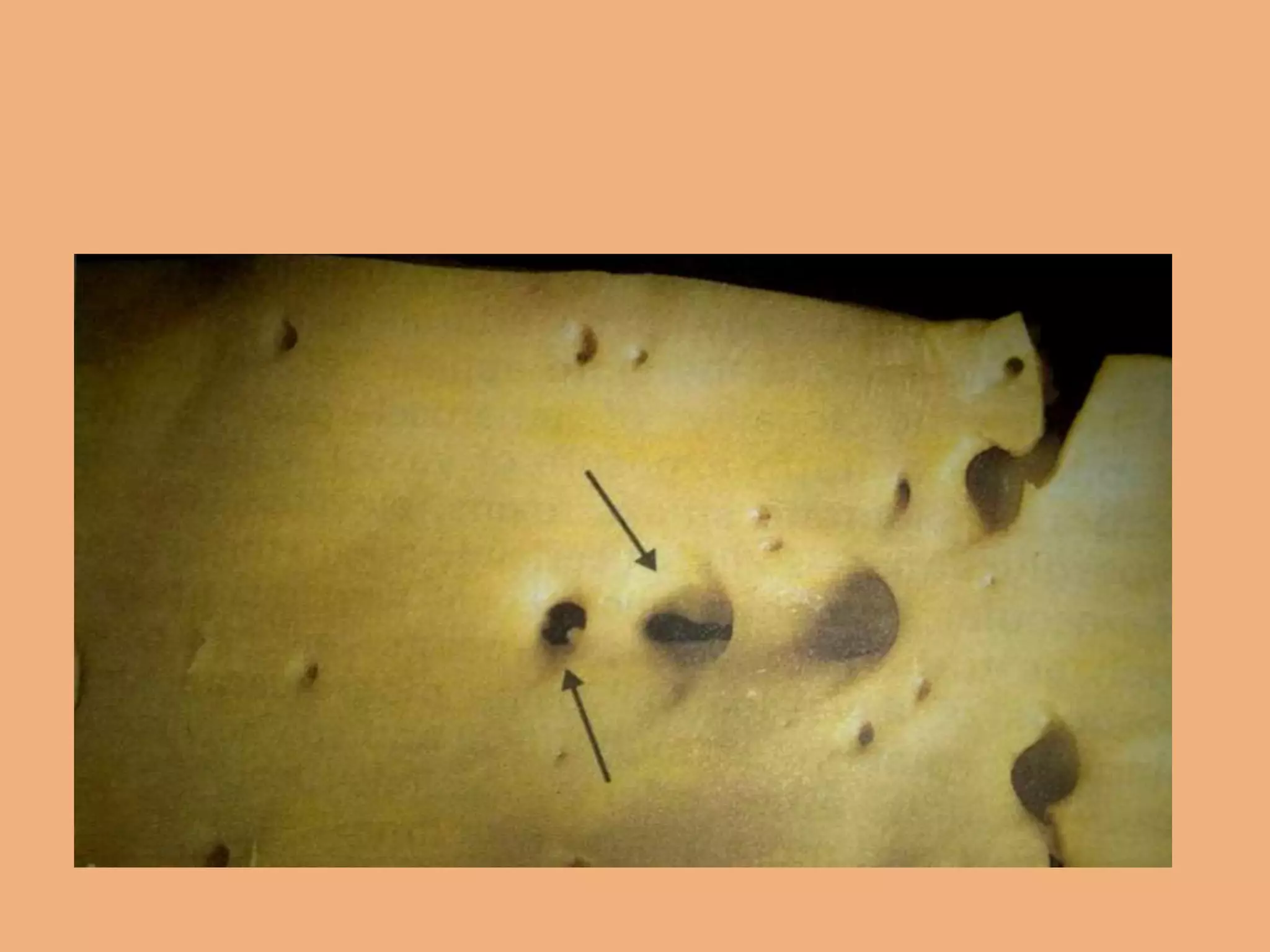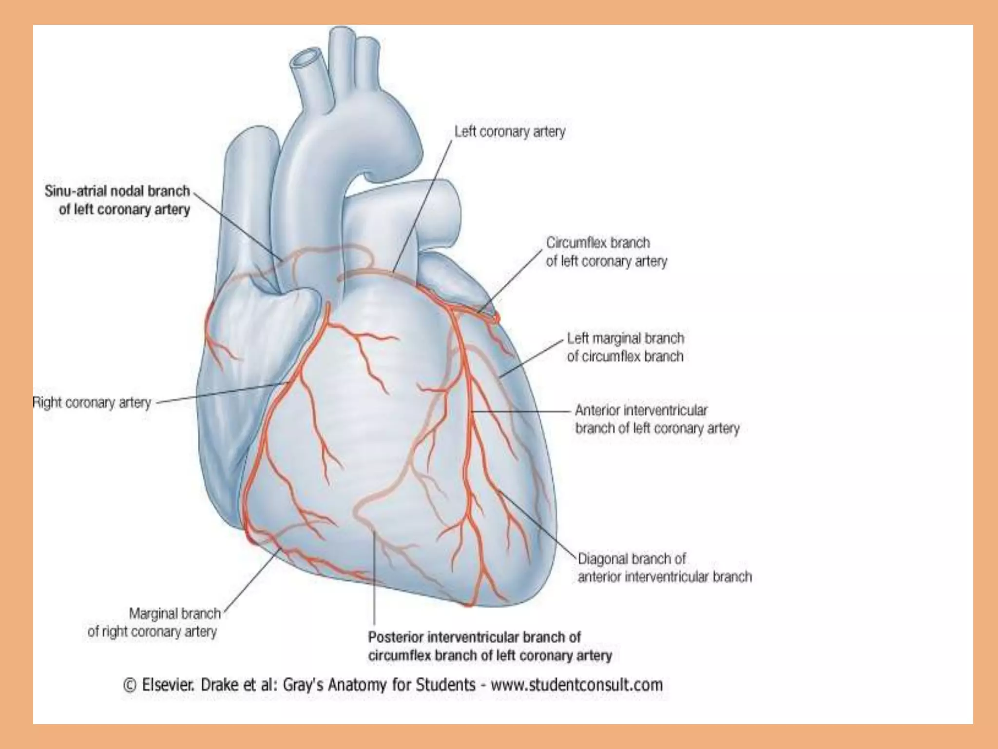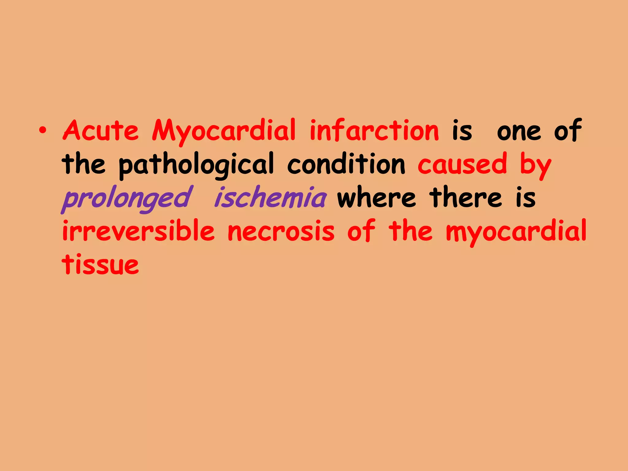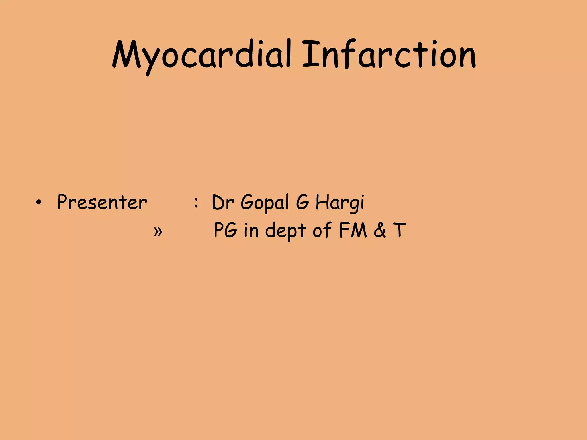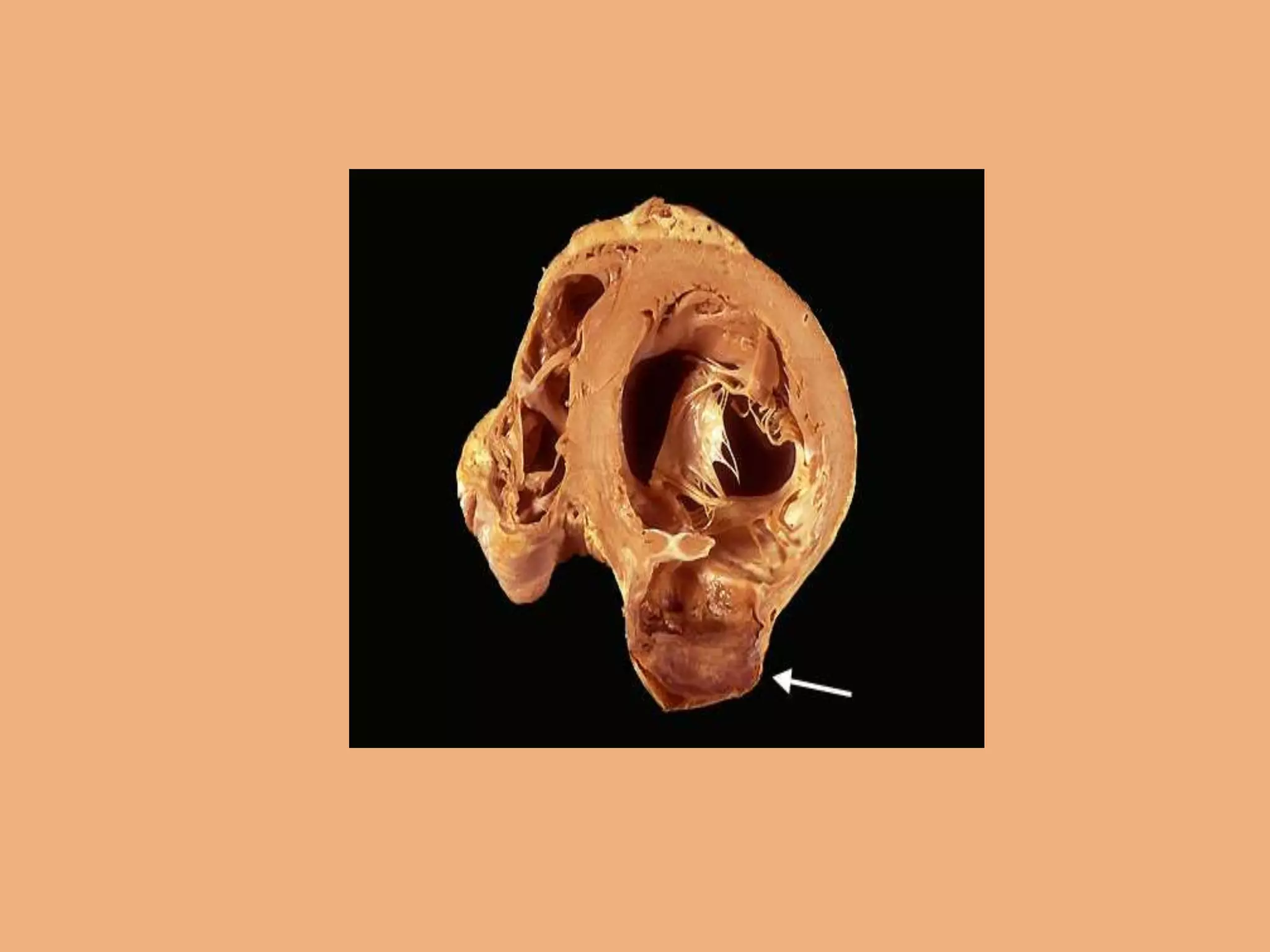 Myocardial infarction occurs when a coronary artery becomes blocked, interrupting blood flow to heart muscle. This causes damage and permanent loss of contraction in that portion of the heart. Over time, the affected area evolves from pallor to yellowing to fibrosis as dead heart cells are removed and replaced by scar tissue. Microscopically, early signs include wavy fibers at the border and loss of striations within infarcted regions. Complications can include arrhythmias, heart failure, mural thrombi, rupture and aneurysm formation depending on the size and location of the infarct. Examination of autopsy specimens involves analysis of coronary arteries and dissection of the heart to identify infarct location, extent and healing stage