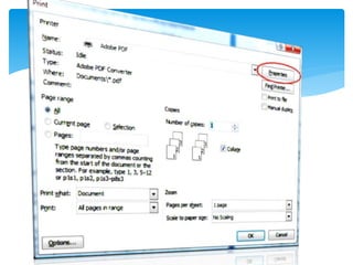 Microsoft Word is a word processing program that allows users to create professional documents with formatting tools and templates, add visual effects like WordArt, and includes features for bullets, numbering, and collaboration. It enables editing documents, printing, and inserting tables, graphs and charts to organize information. The objectives of MS Word are word processing, editing, protecting documents, and providing an easy to use interface.