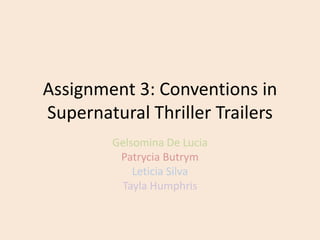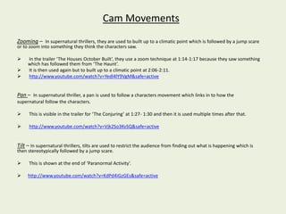 This document discusses conventions used in supernatural thriller trailers. It covers various cinematic techniques including camera movements like zooming and panning to build tension. Composition and framing, as well as lighting, editing and sound design are discussed. Common character archetypes and narrative structures are also summarized, including a build up of scares and a climactic jump scare at the end of trailers. Locations and costumes used help set the tone for supernatural events. Overall, the document provides an overview of techniques employed in trailers for this genre to effectively tease and scare audiences.