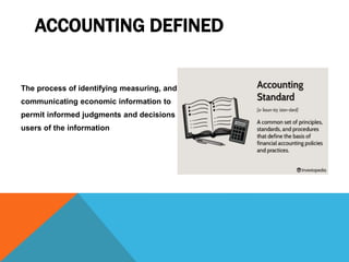 This presentation provides an overview of accounting principles and standards. It defines accounting as identifying, measuring, and communicating financial information to allow for informed decisions. Accounting standards provide common principles, procedures, and policies to improve transparency. Specific standards cover revenue recognition, asset valuation, cash flow reporting, inventory costs, leases, taxes, intangible assets, and more. The accounting standards board of India issues standards following ICAI principles with input from advisory committees.