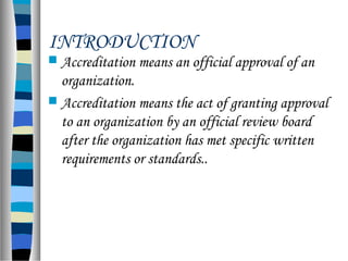 This presentation discusses accreditation in healthcare education. Accreditation involves an official review and approval of an institution to ensure it meets set standards. It aims to maintain quality, improve institutions, and protect the public. The process involves a self-study report and site visit, followed by a decision on accreditation. In India, the Indian Nursing Council plays a key role in accrediting nursing programs and regulating nursing education standards.
