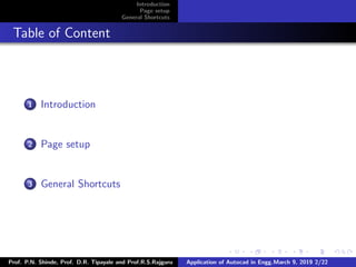 The document provides an overview of AutoCAD and describes various shortcuts and commands for page setup, drawing, and editing in AutoCAD. It introduces AutoCAD as 2D and 3D modeling software widely used in engineering and outlines shortcuts for common tasks like saving files, undoing/redoing actions, and copying/pasting. The document also lists commands for setting up pages, units and drawing styles as well as shortcuts for drawing, editing, and arranging objects in AutoCAD drawings.
