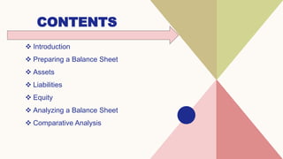 This presentation discusses preparing and analyzing balance sheets. It begins by introducing balance sheets as financial statements that provide a snapshot of a company's financial position at a specific time. The presentation then covers preparing a balance sheet by listing assets, liabilities, and equity. It also discusses analyzing balance sheets by evaluating liquidity, financial risk, profitability, and comparing balance sheets over time and between companies. The goal is to equip attendees with the knowledge to make informed financial decisions.