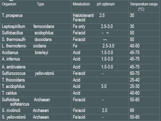 This document summarizes bioleaching, which uses microorganisms to extract metals from minerals and ores. It discusses the history of bioleaching and microorganisms used, including Thiobacillus ferrooxidans and Leptospirillum ferrooxidans. Direct bacterial leaching involves dissolution of the metal directly by bacterial activity, while indirect leaching uses bacteria to generate acidity or solubilize the metal. Examples of direct and indirect leaching include uranium extraction. Commercial bioprocesses include heap, in situ, and copper leaching. Key factors that affect bioleaching are temperature, pH, microbial diversity, population density, and physicochemical conditions.