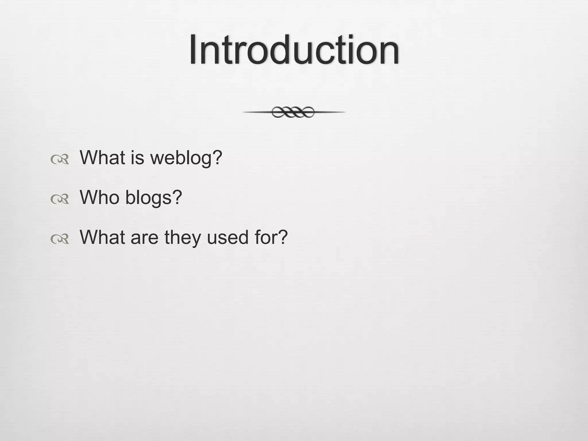 This document discusses the history and role of weblogs or blogs, particularly in relation to journalism and newspapers. It outlines how The Guardian launched one of the earliest newspaper blogs in 2000 to collect noteworthy online content and engage readers through hyperlinks and two-way communication. By 2008, The Guardian's blog evolved into a community-driven "Comment is Free" section. The document also quotes bloggers and The Guardian's editor emphasizing how blogs can provide passionate perspectives that complement traditional journalism.