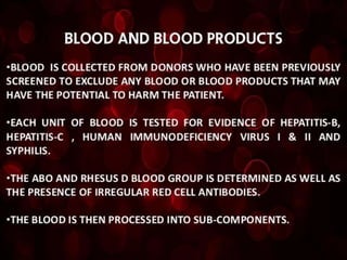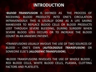 Whole blood, packed red blood cells, fresh frozen plasma, platelets, and cryoprecipitate are the main blood components used for transfusions. Each component has a specific composition and purpose. Whole blood contains all blood components and is used for volume replacement after significant blood loss. Packed red blood cells contain mostly red blood cells and increase oxygen carrying capacity, while fresh frozen plasma contains clotting factors to treat bleeding disorders. Platelets help stop bleeding and cryoprecipitate contains high levels of factor VIII and fibrinogen. Nurses must closely monitor patients during transfusions for signs of reactions and ensure appropriate screening, consent, and administration of blood products.