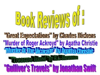 The document consists of homework by Bhavya Popli, which includes book reviews of 'Great Expectations' by Charles Dickens and 'Murder of Roger Ackroyd' by Agatha Christie. 'Great Expectations' follows the life of Pip, an orphan who struggles with personal growth, wealth, and relationships, ultimately conveying themes of self-worth and gratitude. 'Murder of Roger Ackroyd' is a mystery narrated by Dr. Sheppard, revealing an unexpected plot twist where he, the narrator, confesses to being the murderer.