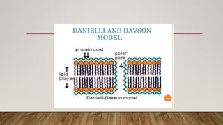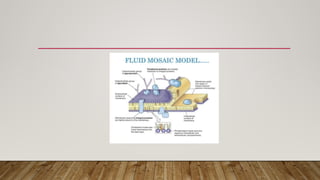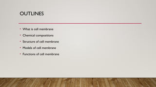 The document discusses the structure and functions of the cell membrane, also known as the plasma membrane, which separates the interior of the cell from its external environment. It details the chemical composition, including lipids, proteins, and carbohydrates, as well as various models used to describe the membrane, such as the fluid mosaic model. The cell membrane plays crucial roles in regulating material passage, maintaining ion distribution, and facilitating cell communication and recognition.