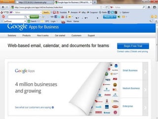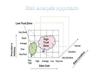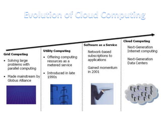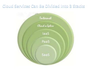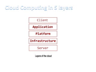 This document discusses cloud computing including its architecture, key facts, risks, applications and future. It defines cloud computing as dynamically scalable and virtualized resources provided over the Internet. The document outlines the layers of cloud computing including software as a service (SaaS), platform as a service (PaaS) and infrastructure as a service (IaaS). It also discusses the benefits of cloud computing like flexibility, scalability and cost savings but notes security risks remain a challenge. The future of cloud computing is predicted to include more hybrid public-private models and growth in developing regions.