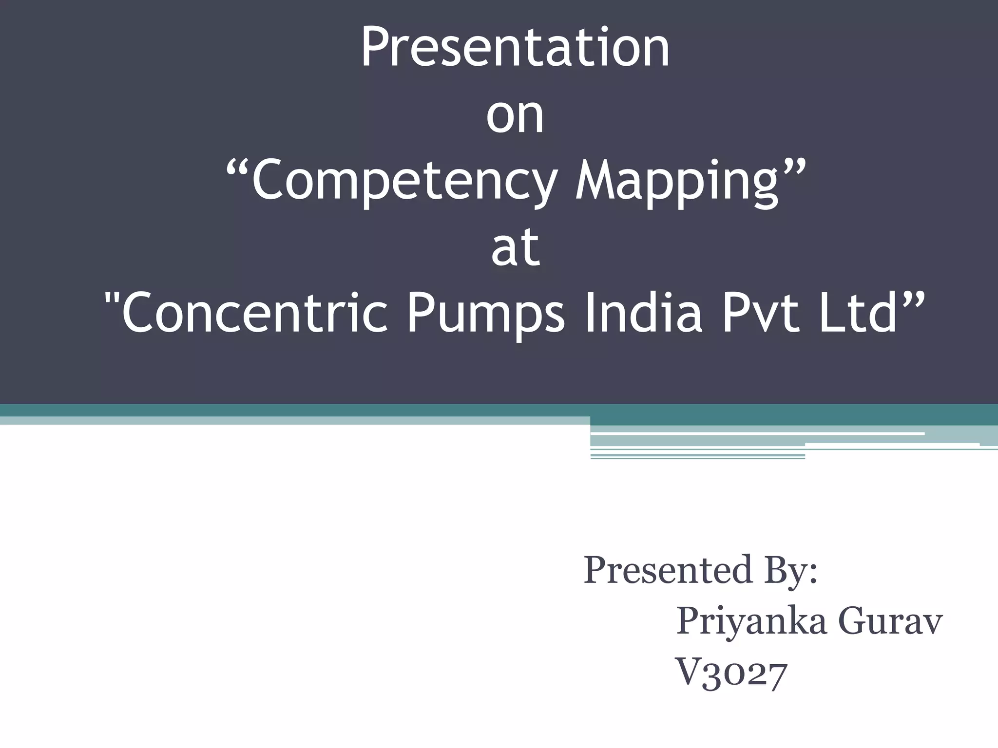 Priyanka Gurav presented on competency mapping at Concentric Pumps India Pvt Ltd. Concentric Pumps manufactures oil, water, and fuel pumps. The presentation covered an overview of competency mapping as an HR tool used for recruitment, training, performance management, and succession planning. Priyanka's research at Concentric Pumps found that employees believe they are competent in their jobs but some need training as their roles have changed. Regular competency mapping was suggested to check employee competency levels and better plan training and manpower.