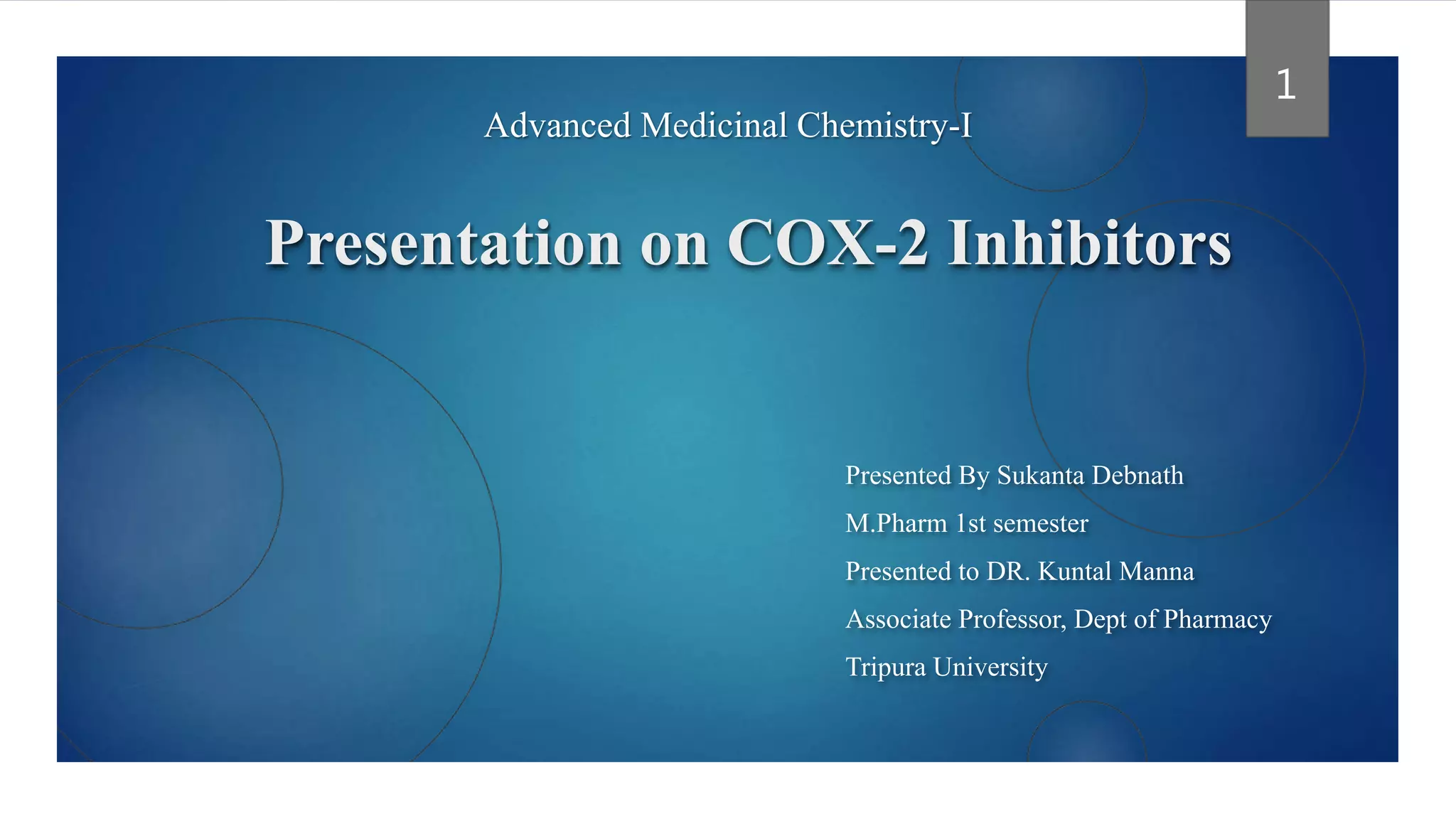 The presentation discusses cyclooxygenase (Cox) enzymes, specifically Cox-2 inhibitors, which are nonsteroidal anti-inflammatory drugs that target Cox-2 to alleviate pain and inflammation. It explores the mechanisms of action, types of Cox enzymes, categories of NSAIDs, as well as the side effects and selective targeting of Cox-2 inhibitors. Additionally, it highlights the structure and classification of non-selective Cox-2 inhibitors and provides examples and references for further study.
