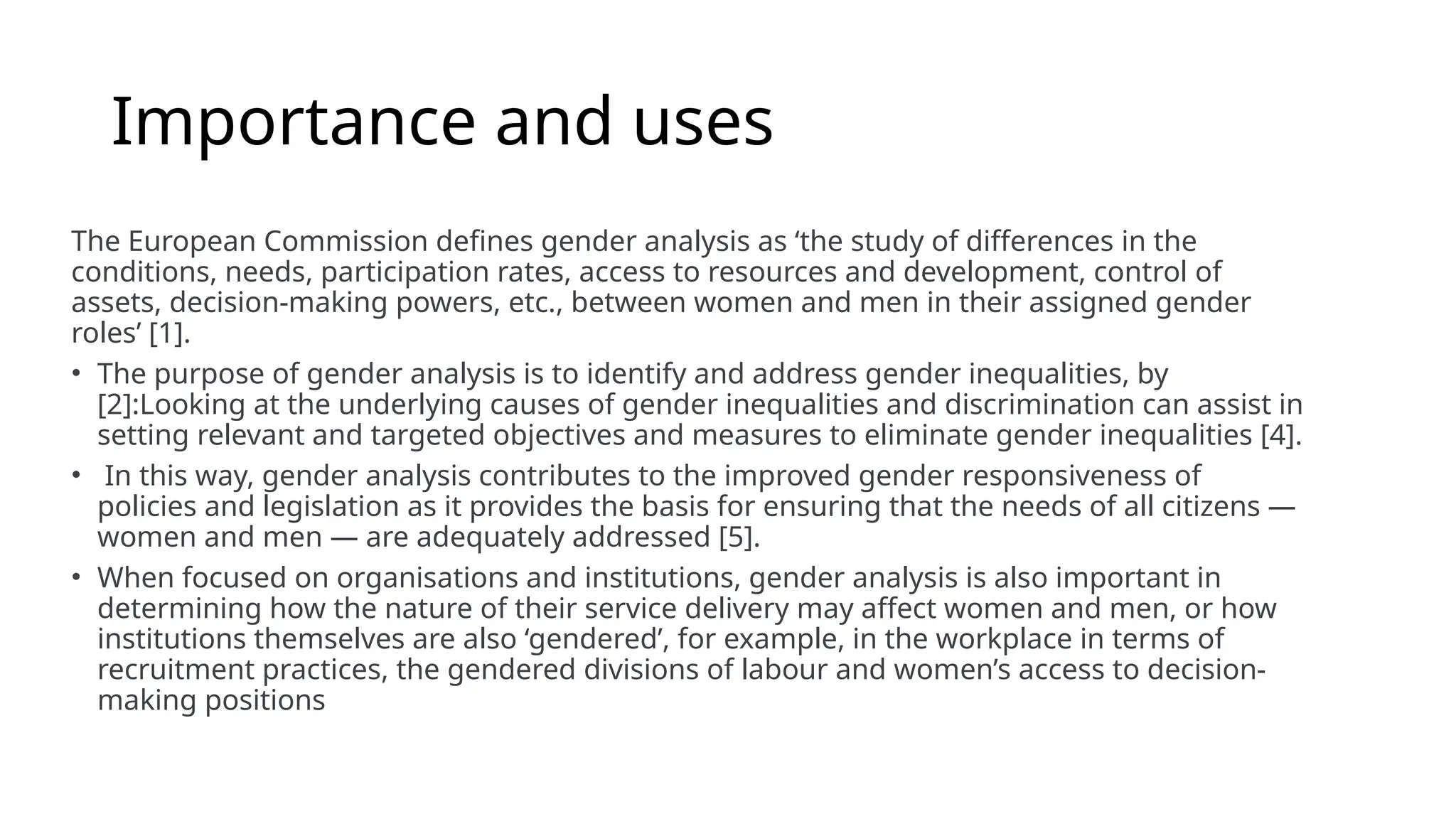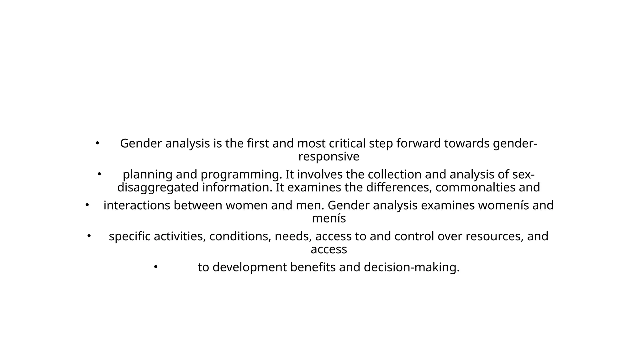 Gender analysis is essential for responsive planning and programming, focusing on sex-disaggregated information to identify differences in access to resources and decision-making between women and men. It aims to address gender inequalities by analyzing underlying causes and helping shape policies that consider the needs of all citizens. Participatory Rural Appraisal (PRA) techniques are highlighted as a cost-effective method for gathering timely data and understanding local priorities.