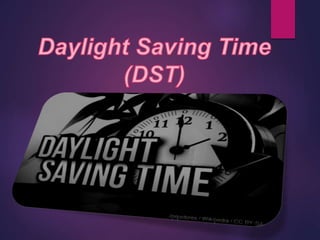 The presentation discusses Daylight Saving Time (DST), which is the practice of setting clocks forward by one hour during the summer months to extend evening daylight. Initiated by Benjamin Franklin in 1784, DST begins in the U.S. on the second Sunday of March and ends on the first Sunday of November, although not all countries observe it. The pros of DST include energy savings and increased recreational time, while the cons involve sleep disruption and potential inefficiencies for non-participating regions.