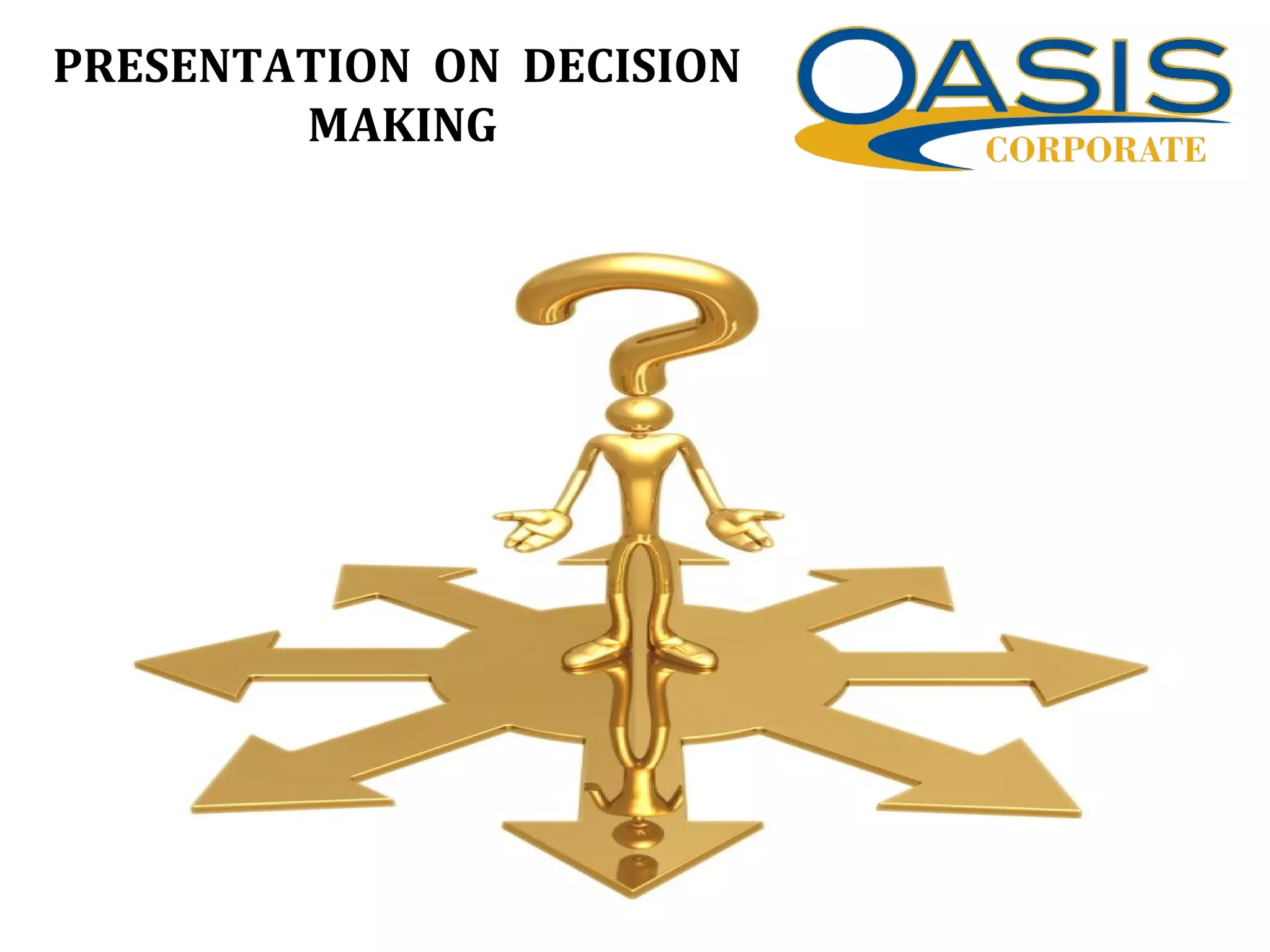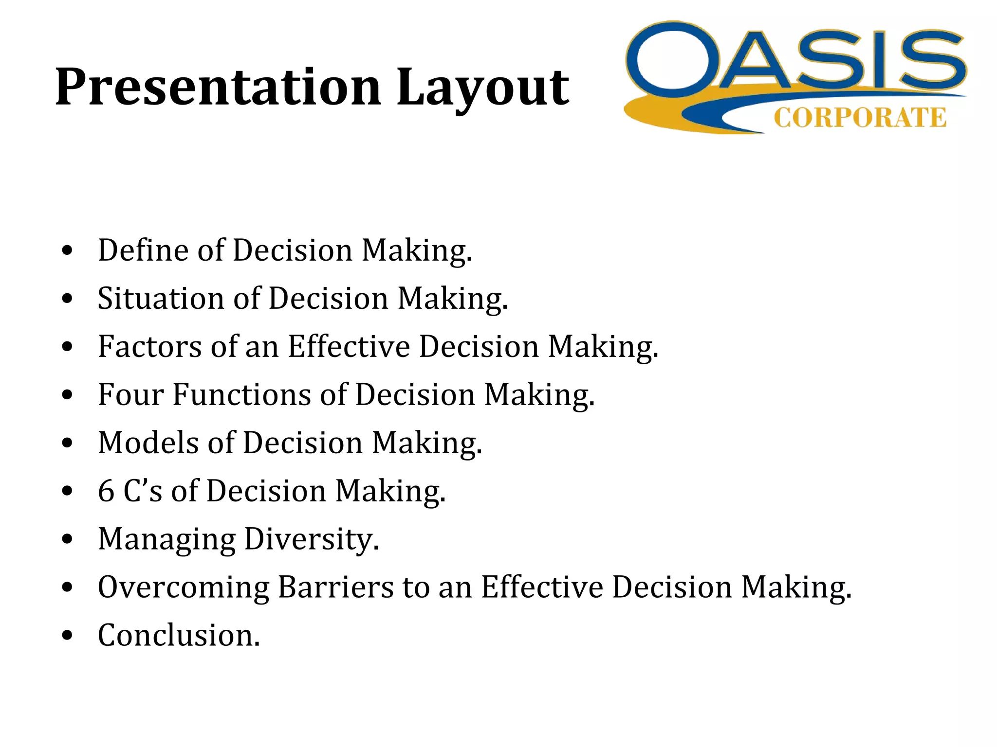 This presentation discusses decision making. It defines decision making as the act of making up your mind after consideration. There are two types of decision making situations: programmed, which are routine decisions made through predetermined rules, and non-programmed, which are novel situations without set rules. The presentation outlines factors for effective decision making like perception, priority, and judgment. It also describes the four functions of decision making: planning, controlling, organizing, and leading. Models of decision making discussed include the rational model and non-rational models like satisficing and incremental. The 6 C's of decision making and managing diversity in group decision making are also summarized.