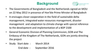 The Bangladesh Delta Plan 2100 is a strategic initiative signed by the governments of Bangladesh and the Netherlands in 2012 aimed at sustainable delta management, comprising a holistic 50 to 100-year plan for land and water management. It focuses on ensuring water and food security, environmental sustainability, and effective disaster management while adapting to climate change. The plan includes monitoring frameworks, investment strategies, and institutional frameworks for implementation across various sectors and regions.
