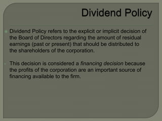 The document discusses dividend policy and its theories of relevance and irrelevance. It states that dividend policy refers to a board's decision on distributing residual earnings to shareholders. There are two choices - pay dividends or reinvest funds. The theories of irrelevance suggest dividend policy does not impact stock price or cost of capital, while relevance theories like Walter's model and Gordon's model suggest dividends are relevant. Gordon's model shows the value of a stock is equal to the present value of future perpetual dividend growth at a constant rate.