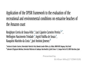 The presentation discusses the Amazon coastal area, focusing on the environmental study of its mangrove forests and recreational beaches affected by human activity and natural processes. It employs the DPSIR framework to analyze drivers, pressures, states, impacts, and responses regarding beach management and environmental conditions. The conclusion highlights the lack of local authority response and recommends measures such as improved planning, environmental monitoring, and sewage management.