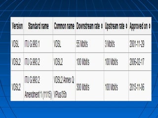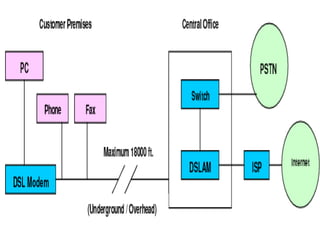 The document provides a history of data transmission, beginning with Alexander Graham Bell and Samuel Morse developing the idea of transmitting data through copper wire. It then discusses the evolution of analog dial-up internet access and the transition to digital transmission. This included the development of DSL technology, with pioneers like Joseph Lechleider demonstrating broadband transmission and John Cioffi developing DMT modulation for DSL. Common DSL variants like ADSL, VDSL, and SDSL are also summarized.