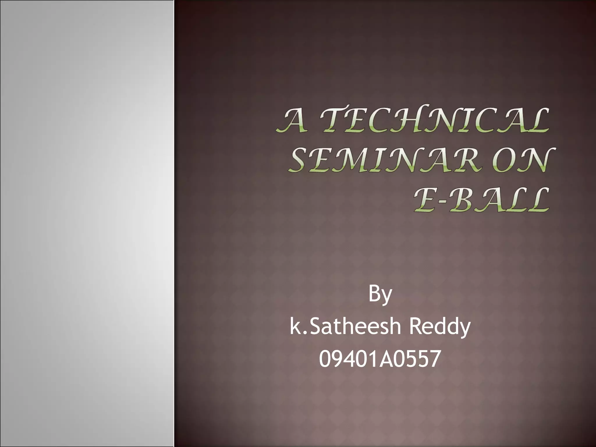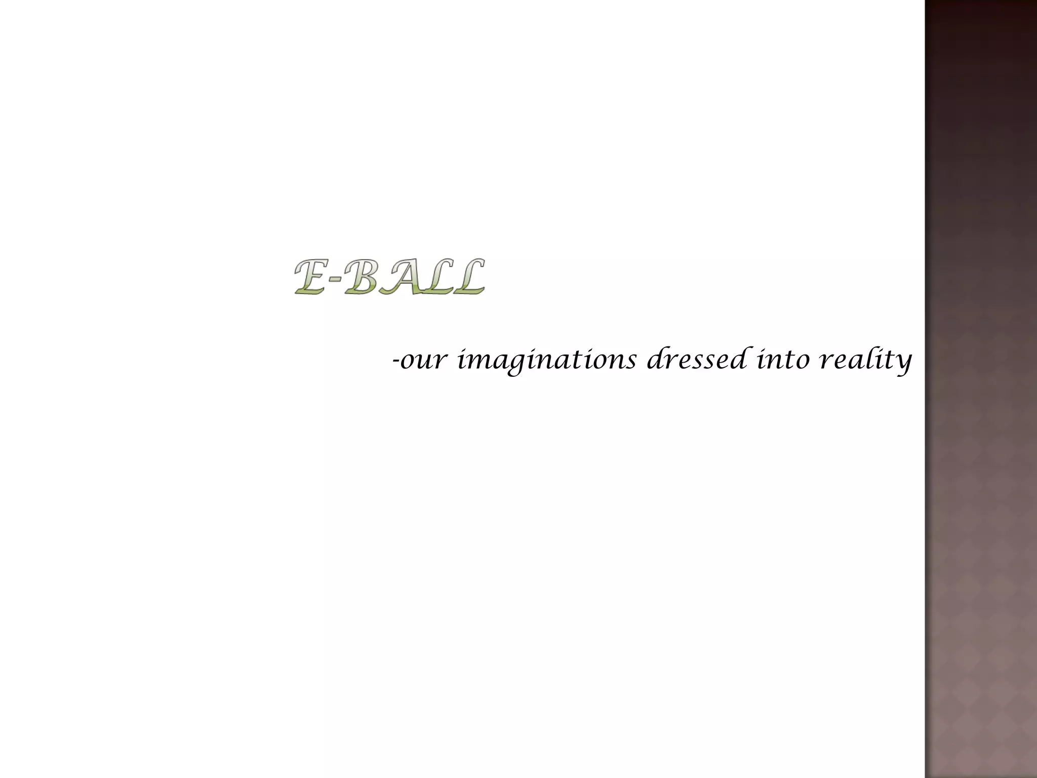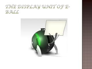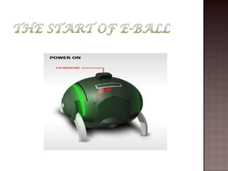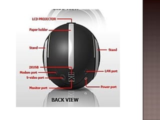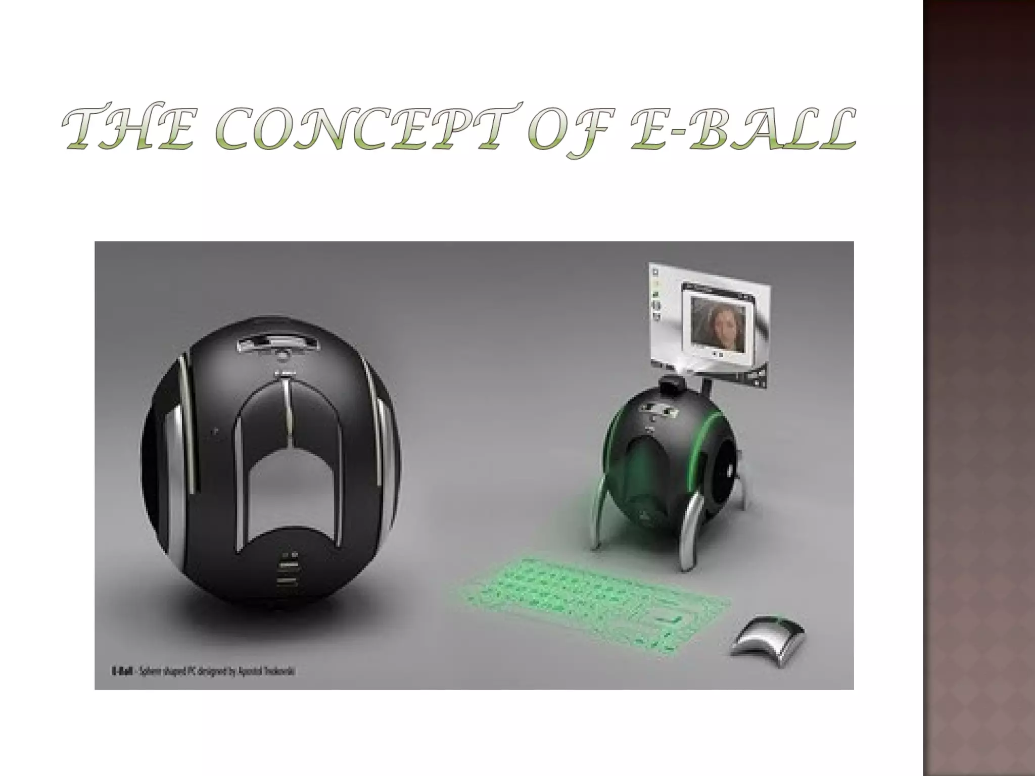 The document describes the E-Ball concept PC, a spherical computer that is the smallest computer design. It has a dual core processor, 2GB of RAM, 350-500GB hard drive, integrated graphics and sound card, wireless optical mouse, and projects a holographic keyboard. The E-Ball is highly portable, has a large memory capacity, and can be used for making presentations on the go. It represents how technology has allowed imaginations to become reality by fitting an entire computer into a small spherical design.