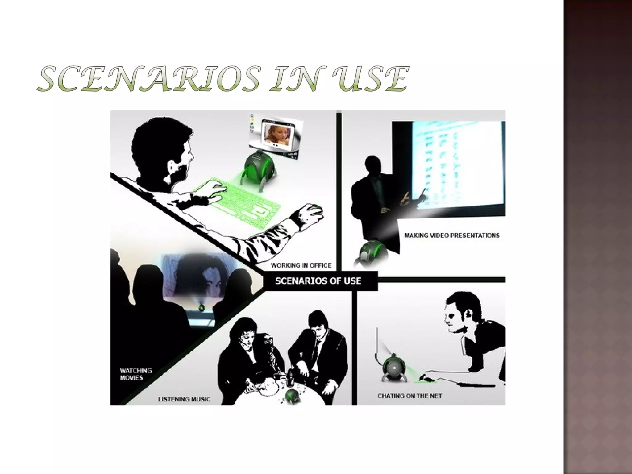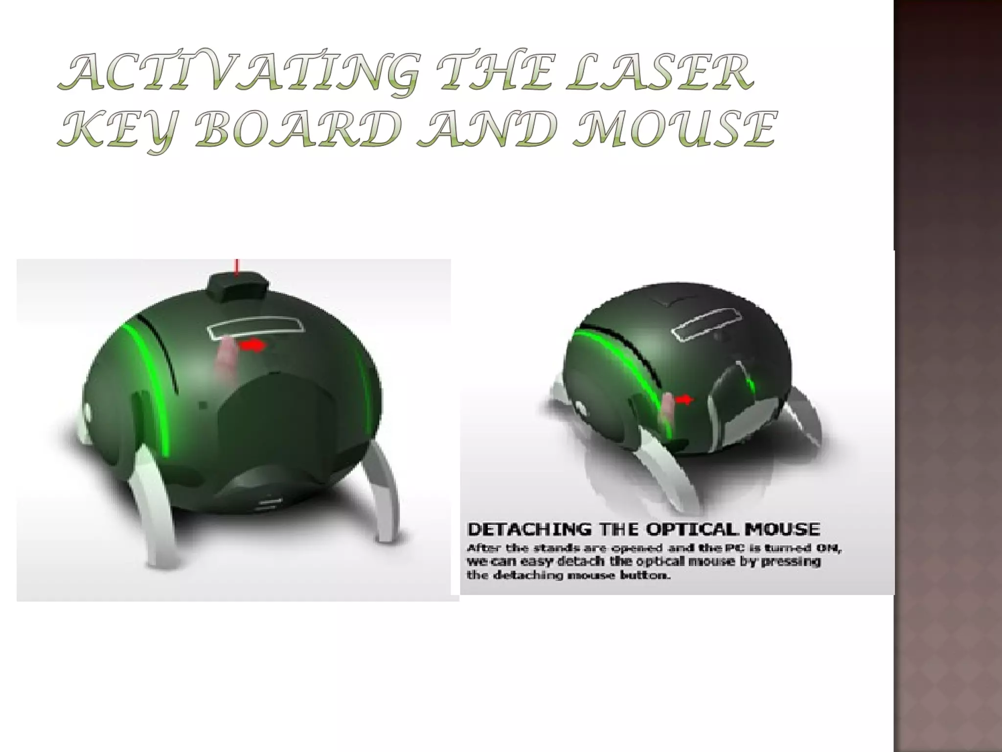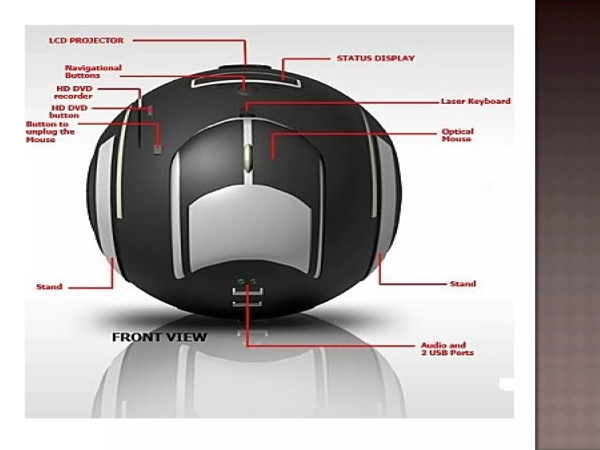 The document describes the E-Ball concept PC, a spherical computer that is the smallest computer design. It has a dual core processor, 2GB of RAM, 350-500GB hard drive, integrated graphics and sound card, wireless optical mouse, and projects a holographic keyboard. The E-Ball is highly portable, has a large memory capacity, and can be used for making presentations on the go. It represents how technology has allowed imaginations to become reality by fitting an entire computer into a small spherical design.