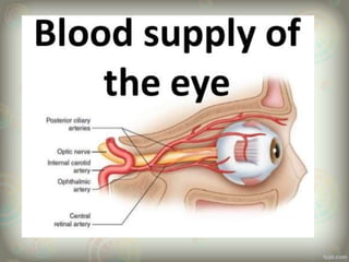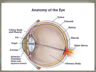 The human eye is roughly spherical and resembles a camera. It has three layers: the outer fibrous layer containing the sclera and cornea, the middle vascular layer containing the choroid, ciliary body and iris, and the inner nervous layer containing the retina. The eye contains two chambers - the anterior chamber between the cornea and lens containing aqueous humor, and the posterior chamber between the lens and retina containing vitreous humor. Key parts include the iris, pupil, choroid, ciliary body, lens, retina and optic nerve. The eye receives nourishment from the choroid and ciliary body and sends signals to the brain via the optic nerve to provide vision.