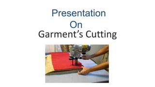 The document discusses cutting in the garments industry. It covers the cutting process, requirements for accurate cutting, different cutting methods including manual and computerized, and various cutting machines used such as straight knife cutters, round knife cutters, and band knife cutters. It also discusses quality control processes for the cutting section to ensure accurate cutting of garment pieces.