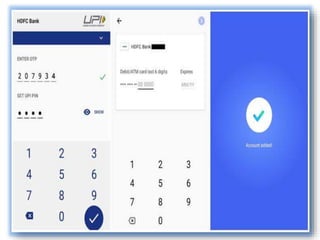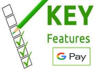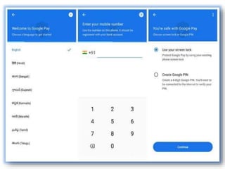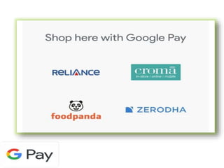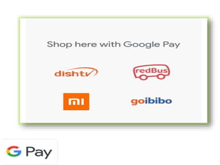 Google Pay is a peer-to-peer payments app in India that allows bank account-to-bank account transfers using UPI (Unified Payments Interface). It aims to enable simple and fast payments without additional features. Google Pay uses BHIM UPI, which powers multiple bank accounts into a single mobile app. Security measures include a PIN for every transaction and login authentication via phone lock screen, fingerprint, or PIN. The app also offers social payments, business payments, referrals, scratch cards, and "Tez Mode" for sharing payments by audio QR code without exchanging private details. Google Pay targets young Indian users and supports multiple local languages.
