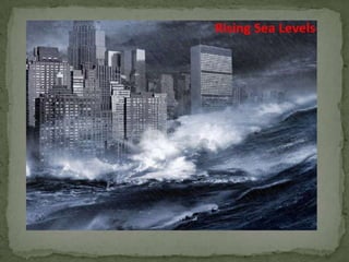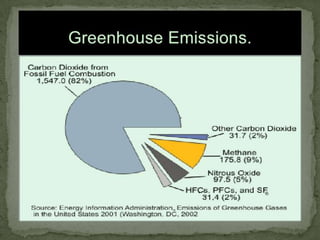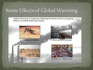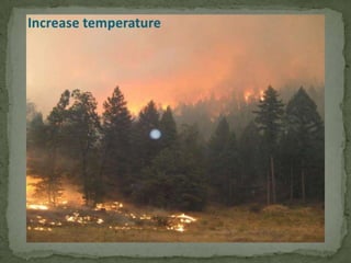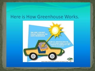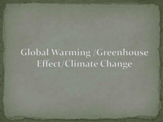 The presentation discusses the concepts of greenhouse effect, climate change, and global warming, highlighting their distinct processes and causes, including human activities like burning fossil fuels and deforestation. It outlines the mechanisms by which the Earth's atmosphere traps heat, leading to rising temperatures, changing weather patterns, and potential remedies to mitigate these effects. It emphasizes the urgent need for alternative energy sources and actions to reduce greenhouse gas emissions.