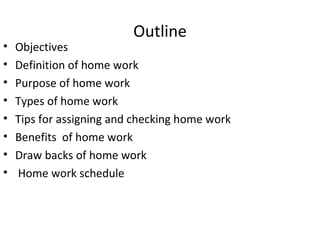 This presentation discusses homework and provides guidelines for teachers on assigning and checking homework. It defines homework as tasks assigned to students to be completed outside of class time to reinforce skills and concepts learned in class. The presentation outlines the objectives, types of homework including practice, preparation, extension and creative work. It provides tips for assigning homework such as ensuring students understand the purpose and can succeed on the tasks. Benefits include better retention and understanding, while drawbacks include loss of interest and pressure on students. A homework schedule is suggested to help organize assignments.