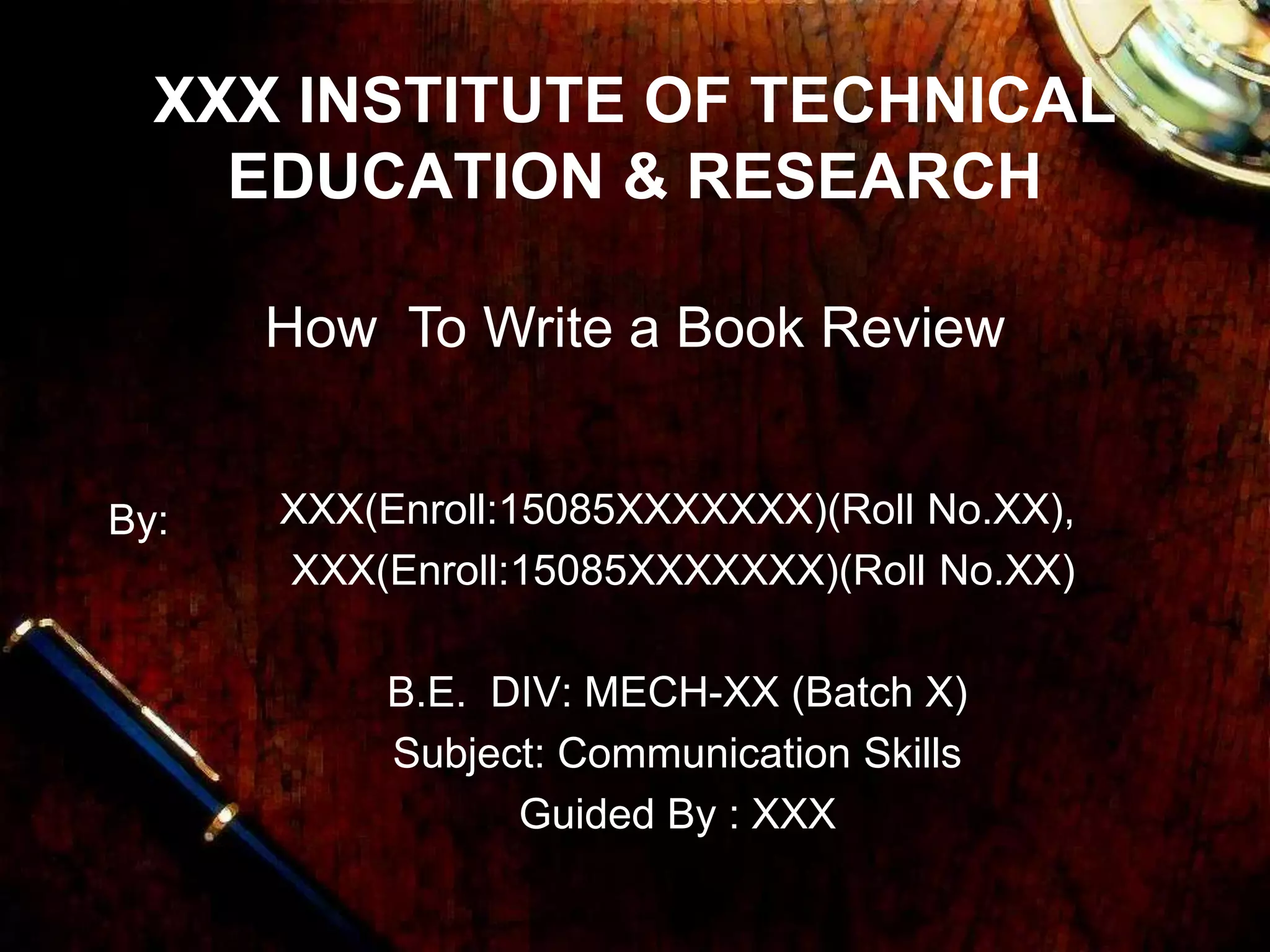 XXX INSTITUTE OFTECHNICAL EDUCATION & RESEARCH XXX(Enroll:15085XXXXXXX)(Roll No.XX), XXX(Enroll:15085XXXXXXX)(Roll No.XX) B.E. DIV: MECH-XX (Batch X) Subject: Communication Skills Guided By : XXX By: How To Write a Book Review