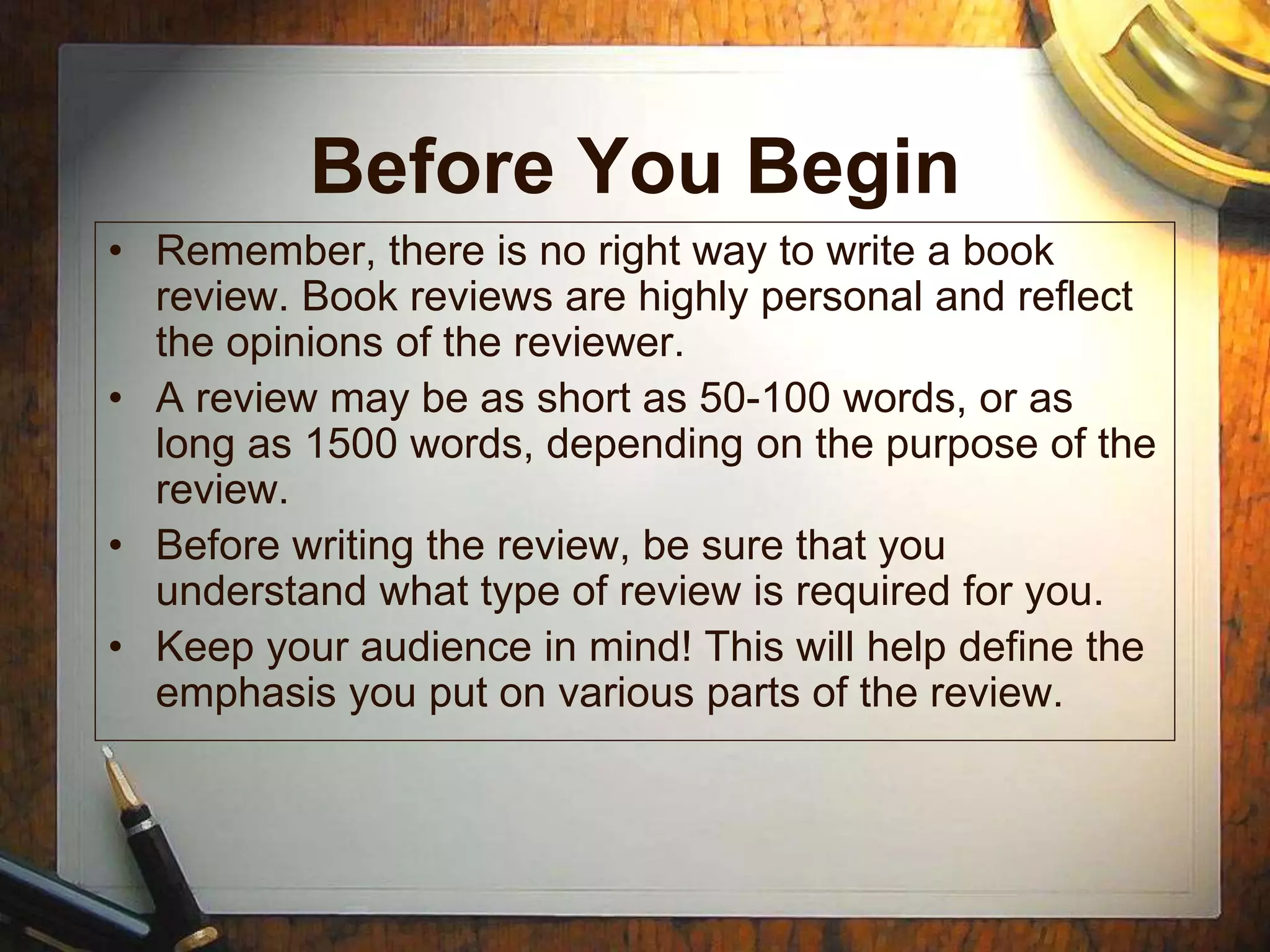 Before You Begin •Remember, there is no right way to write a book review. Book reviews are highly personal and reflect the opinions of the reviewer. • A review may be as short as 50-100 words, or as long as 1500 words, depending on the purpose of the review. • Before writing the review, be sure that you understand what type of review is required for you. • Keep your audience in mind! This will help define the emphasis you put on various parts of the review.