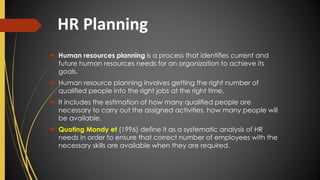 Human resource planning is a systematic process that identifies current and future human resource needs in an organization to achieve its goals. It involves forecasting the demand and supply of qualified personnel and ensuring optimal use of existing resources while addressing potential surpluses or shortages. Effective HR planning is essential for adapting to changes in technology, market dynamics, and workforce turnover, ultimately aiding organizational expansion and efficiency.