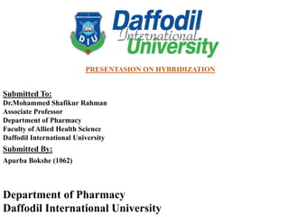 This document provides an overview of hybridization in chemistry. It defines hybridization as the mixing of atomic orbitals with the same energy level to form new hybrid orbitals. Hybridization can be classified as sp, sp2, sp3, sp3d, sp3d2, or sp3d3 based on the types of orbitals involved. Examples are provided for each type of hybridization, including their orbital orientations and molecular geometries. Common molecules that demonstrate different hybridizations, such as methane and phosphorus pentachloride, are described.