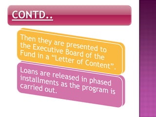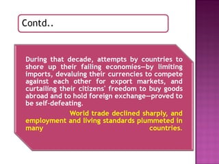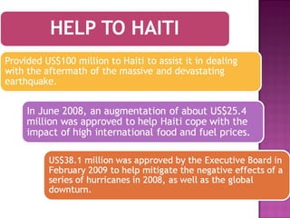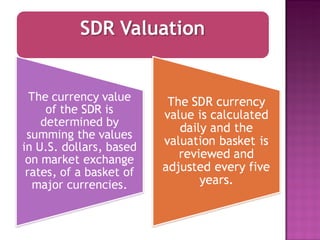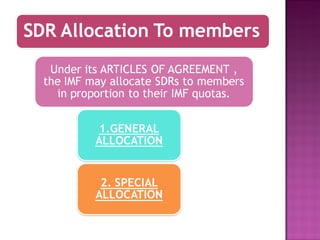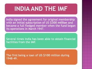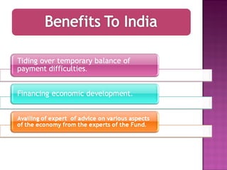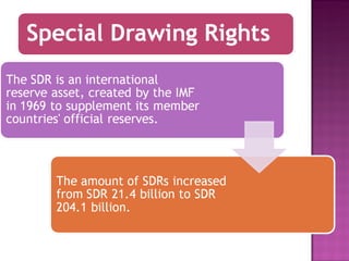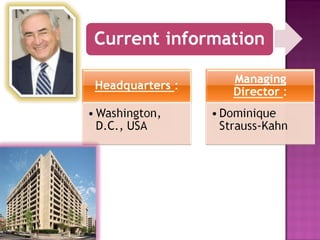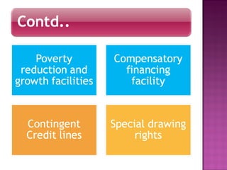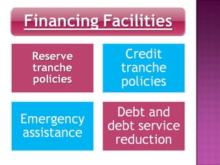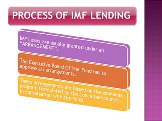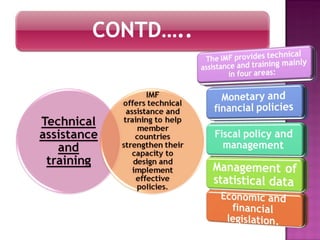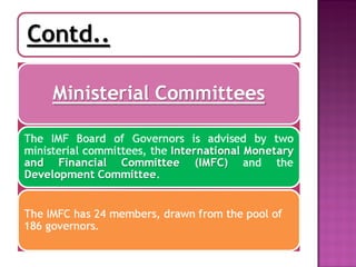 The International Monetary Fund (IMF) is an organization formed to stabilize international exchange rates and facilitate development. It aims to strengthen member economies by making funds available, promote exchange stability, facilitate balanced trade growth, lessen disequilibrium in international balances of payments, and reduce poverty by enabling sustainable growth. The IMF monitors members' economies and policies, provides loans to countries with depleted reserves, stagnant economies, and rising bankruptcies, and keeps records of members' allocations and holdings of Special Drawing Rights, a supplementary reserve asset.