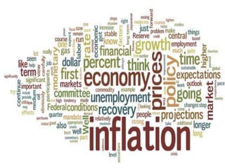 The presentation discusses inflation, defining it according to Pigou as the growth of money income exceeding income-earning activity. It categorizes types of inflation based on intensity, outlines government responses, and highlights demand pull and cost push inflation as key contributors. The document also includes current economic indicators for Bangladesh, such as GDP growth and inflation rates.