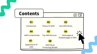 The document provides an overview of Amazon Web Services (AWS), including its history, how it operates, key services, advantages, and disadvantages. AWS, launched in 2006, offers a comprehensive cloud computing platform that includes services for storage, computing power, and database management, enabling scalable and flexible IT resource management. The document also discusses various applications of AWS in industries such as streaming, lodging, and scientific research, as well as its three cloud computing models: IaaS, PaaS, and SaaS.