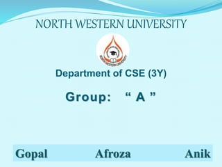 The document outlines the development of a bank management system by a group of computer science students from North Western University, aiming to facilitate various banking operations such as account management, cash transactions, and reporting. It details the system's purpose, application description, software and hardware requirements, and provides a layout of the modules included in the application. Additionally, it emphasizes the ease of use and planned future features of the system.
