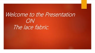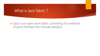 The document provides an overview of lace fabric, detailing its definition, features, types, and historical development from the sixteenth century in Europe. It explains the construction processes of both handmade and machine-made lace, descriptions of various types like bobbin and needle point lace, and the machinery used in production. Additionally, it discusses the uses of lace in apparel and home furnishings, highlighting its decorative role and material compositions.