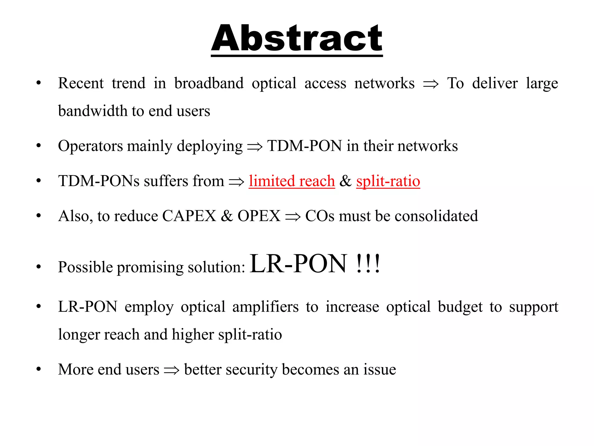 This document summarizes challenges and solutions for long-reach optical access networks (LROA). Key challenges include noise from optical amplifiers, burst-mode transmission, suitable amplifiers, and security weaknesses. Proposed LROA architectures use remote amplification units and hybrid amplifiers to extend reach over 100km while supporting thousands of users. Security measures involve monitoring systems and reconfigurable devices to detect attacks and isolate malicious users. LROA networks can simultaneously deliver high bandwidth to more users over longer distances.