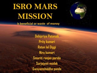 The document discusses India's Mars Orbiter Mission (MOM) and debates whether it is beneficial or a waste of money. It provides background on ISRO and describes the technological and scientific objectives of MOM, such as designing an orbiter to study Mars' surface features, morphology, and atmosphere. Both advantages, like furthering human success and reducing poverty long-term, and disadvantages, like opportunity costs and questions around India's economic capabilities, are presented. While some argue the ₹450 crore cost is a misuse of funds, the conclusion states that MOM has yielded a dramatic increase in knowledge about Mars and propelled India ahead technologically compared to other space rivals.