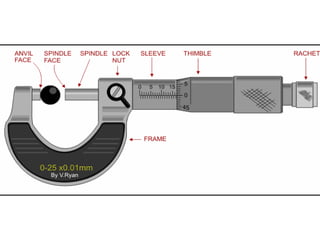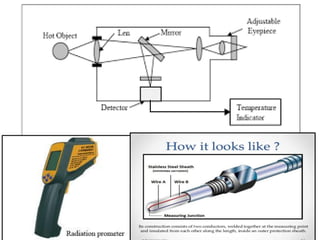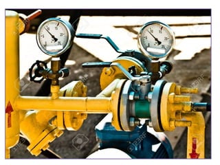 Measurement and metrology involve measuring devices that determine parameters like pressure, temperature, and flow rate. Measuring instruments have sensing, conditioning, and presentation elements. Common instruments include pressure gauges, thermometers, tachometers, and dynamometers.