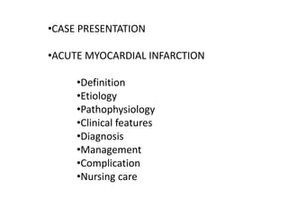 A 55-year-old male smoker and alcoholic presented with chest pain and was diagnosed with a myocardial infarction based on electrocardiogram and cardiac enzyme changes. He received treatment including aspirin, nitroglycerin, morphine, and streptokinase thrombolysis and was admitted to the intensive care unit. Nursing care focused on monitoring, providing pain relief, and health teaching prior to discharge.
