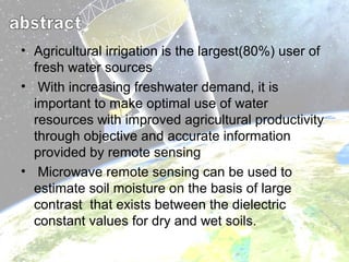 Agricultural irrigation accounts for 80% of fresh water usage. Microwave remote sensing can be used to estimate soil moisture levels based on differences in dielectric constants between dry and wet soils. Monitoring soil moisture at field scales through microwave remote sensing can help improve irrigation scheduling for precision agriculture and predict crop yields at larger scales. It allows for monitoring of vegetation distribution, health, and water needs for agricultural applications through clouds.