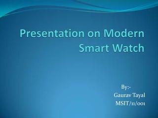 The i'm Watch is a smartwatch developed by Blue Sky that was demoed at ARM TechCon 2011. It has a 1.54" color display with 240x240 pixel resolution, 64-128MB of RAM, 4GB of flash storage, and runs Android. The i'm Watch is compatible with Android, BlackBerry, iOS, Symbian, and Windows Phone smartphones, and has features like an address book, multitasking, music playback, news, photos, and video calling. It can operate for up to 48 hours on standby or 3 hours of talk time on a single charge.