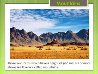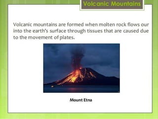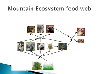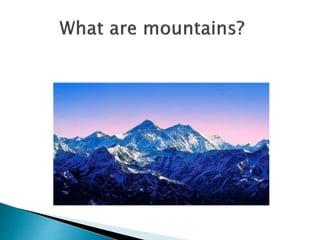 Mountain ecosystems are important because mountains are home to 10% of the world's population and cover 25% of the earth's land. They supply fresh water to half the world's population and are centers of biological diversity. However, mountain ecosystems face threats such as habitat loss, species loss, and impacts on mountain peoples from factors like deforestation, infrastructure development, agriculture, tourism, and climate change. To protect mountain ecosystems, recommendations include changing attitudes, establishing environmental taxes, education programs, research, and protected areas. Bangladesh's mountain ecosystems include the Chittagong Hill Tracts and Sylhet Division, and the government is taking steps like reforestation, awareness campaigns, and laws to promote conservation.