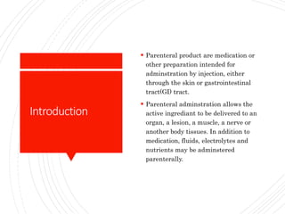 The document provides information about needles and syringes used for parenteral administration of medications and other substances. It discusses the anatomy of needles, including gauge size, point, bevel, lumen, shaft and hub. It also covers penetration points like intravenous, intramuscular, subcutaneous, and intradermal. Syringe anatomy is explained as barrel, plunger and tip. Different types of syringes like hypodermic, tuberculin, insulin and prefilled are described. Safety features of modern syringes to prevent infection are also mentioned. Proper disposal of used needles is highlighted.