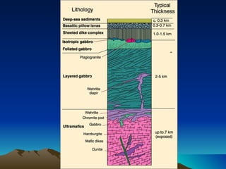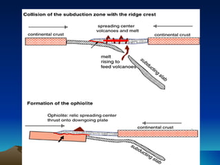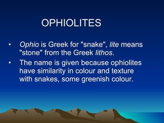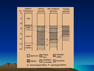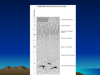 Ophiolites are fragments of oceanic crust and upper mantle that have been uplifted and emplaced on continental margins. They consist of five main layers: sediment, pillow basalt, sheeted dikes, gabbro, and peridotite. Ophiolites provide evidence for seafloor spreading and plate tectonics. While similar in composition, ophiolites differ from oceanic crust in thickness, age, density, and composition due to uplift and emplacement processes. Ophiolites in Pakistan are found in collision zones from the Indian plate colliding with the Eurasian and Afghan plates.