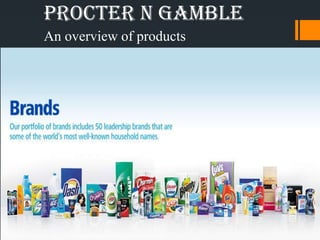 Procter & Gamble has a wide product mix across beauty and grooming, health and well-being, and household care brands. The company offers deep product lines in categories like Head & Shoulders with multiple compositions, and long product lines that include over 10 brands. P&G's product mix is defined by the combination of its product width across three lines, product length within each line, and product depth within popular brands.