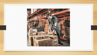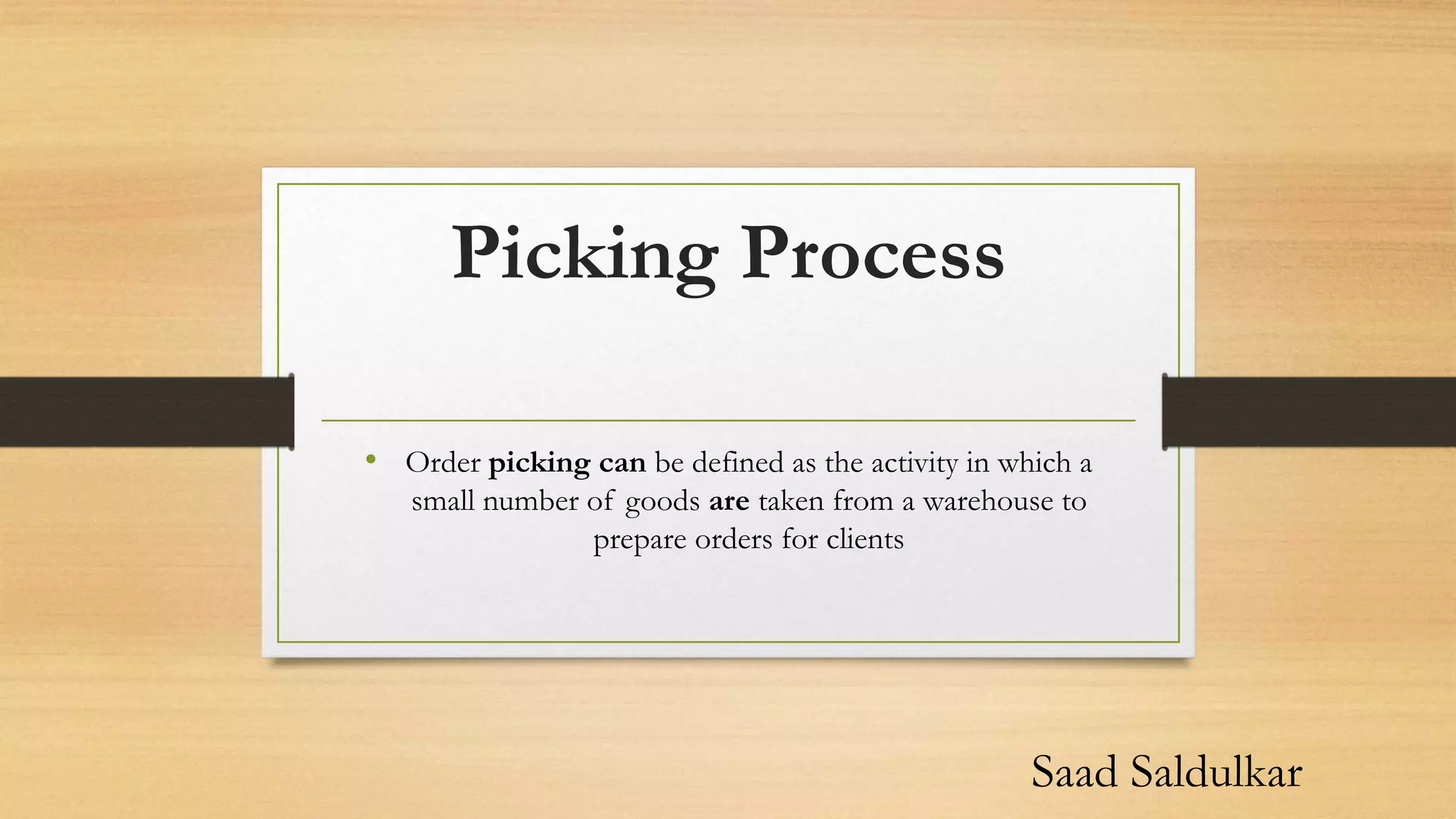 Order picking involves selecting individual items from a warehouse to fulfill client orders. There are several common order picking methods, each with advantages and disadvantages. Discrete order picking involves one picker selecting one full order at a time, providing fast fulfillment but lower efficiency due to travel time. Batch picking allows a picker to select multiple orders' worth of the same item in one trip, improving productivity but risking mistakes. Wave and zone-wave picking combine aspects of discrete and batch picking. Proper inventory management techniques like regular audits and identifying responsible personnel can help address issues that cause delays or losses.