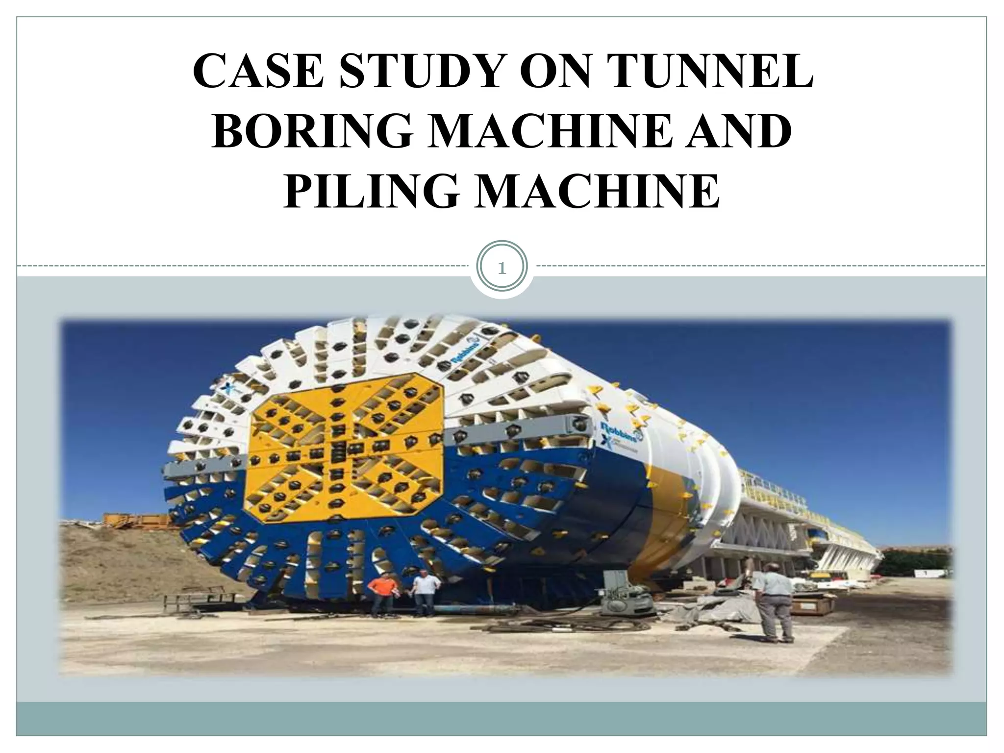 This document presents a detailed case study on Tunnel Boring Machines (TBMs) and piling machines, explaining their technologies, types, and applications in construction and excavation. It discusses various TBMs like slurry shield and single shield machines, as well as piling methods like diesel impact and vibratory hammers, including case studies illustrating their performance. The conclusion emphasizes the significant impact of boring machines on urban infrastructure and the importance of selecting the appropriate machinery based on specific project requirements.